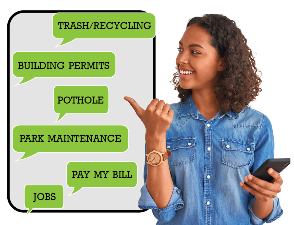 Text a single keyword such as trash, jobs, permits, etc. any time, day or night to 303-502-TEXT(8398) to get information and answers to common city FAQs.