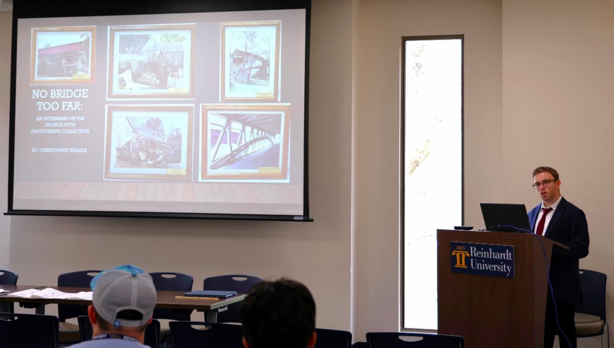 Christopher Walker’s (RU – 2024) presentation, “No Bridge Too Far,” explained how a donation became an engaging experience. A packed room listened intently as he explained his archival work during an internship with the Reinhardt Office of Advancement. Walker examined and organized the George Fitts Photograph Collection, a generous donation featuring Fitts’ photography that documents his research of covered bridges, mills, and water wheels.