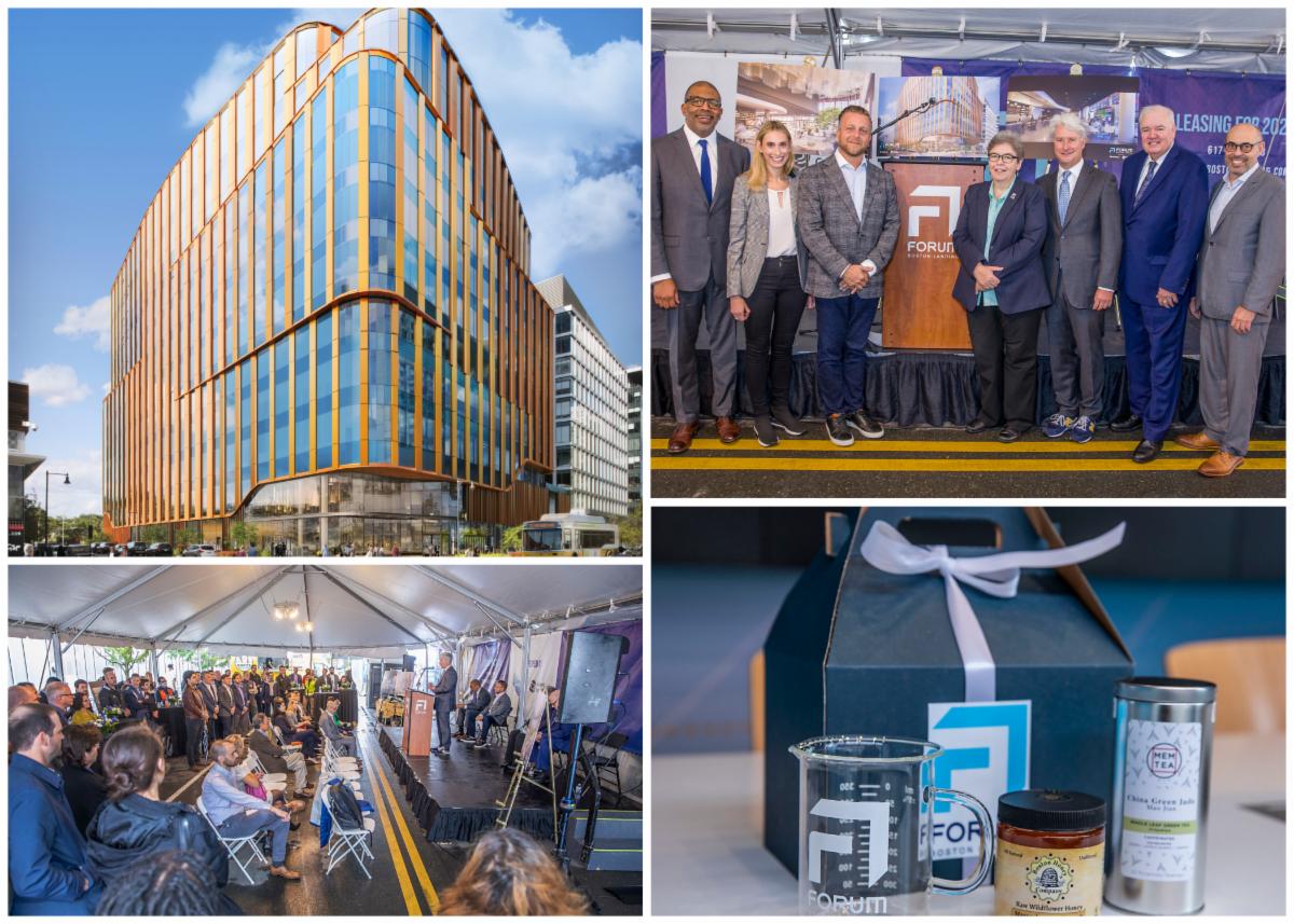 Elected officials and executives from Lendlease and Ivanhoé Cambridge celebrated the groundbreaking for FORUM, a $500 million life science development at 60 Guest St. in the Boston Landing development. Despite gusty winds and rain, guests packed the tent to enjoy food from local favorite Roxy’s Grilled Cheese, live music, an interactive art experience and a gift box that included a beaker-shaped mug and tea from a local shop. | |