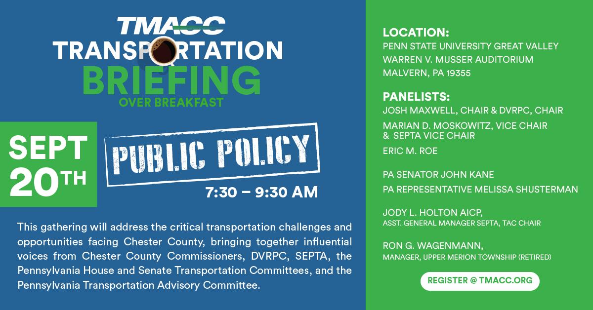 TMACC's Public Policy Breakfast Briefing is a must-attend event for anyone invested in the future of our region's transportation. This gathering will address the critical transportation challenges and opportunities facing Chester County, bringing together influential voices from Chester County Commissioners, DVRPC, SEPTA, the Pennsylvania House and Senate Transportation Committees, and the Pennsylvania Transportation Advisory Committee. Attendees will gain valuable insights into current transportation initiatives, funding priorities, and policies that directly impact municipalities, businesses, and organizations throughout the region.