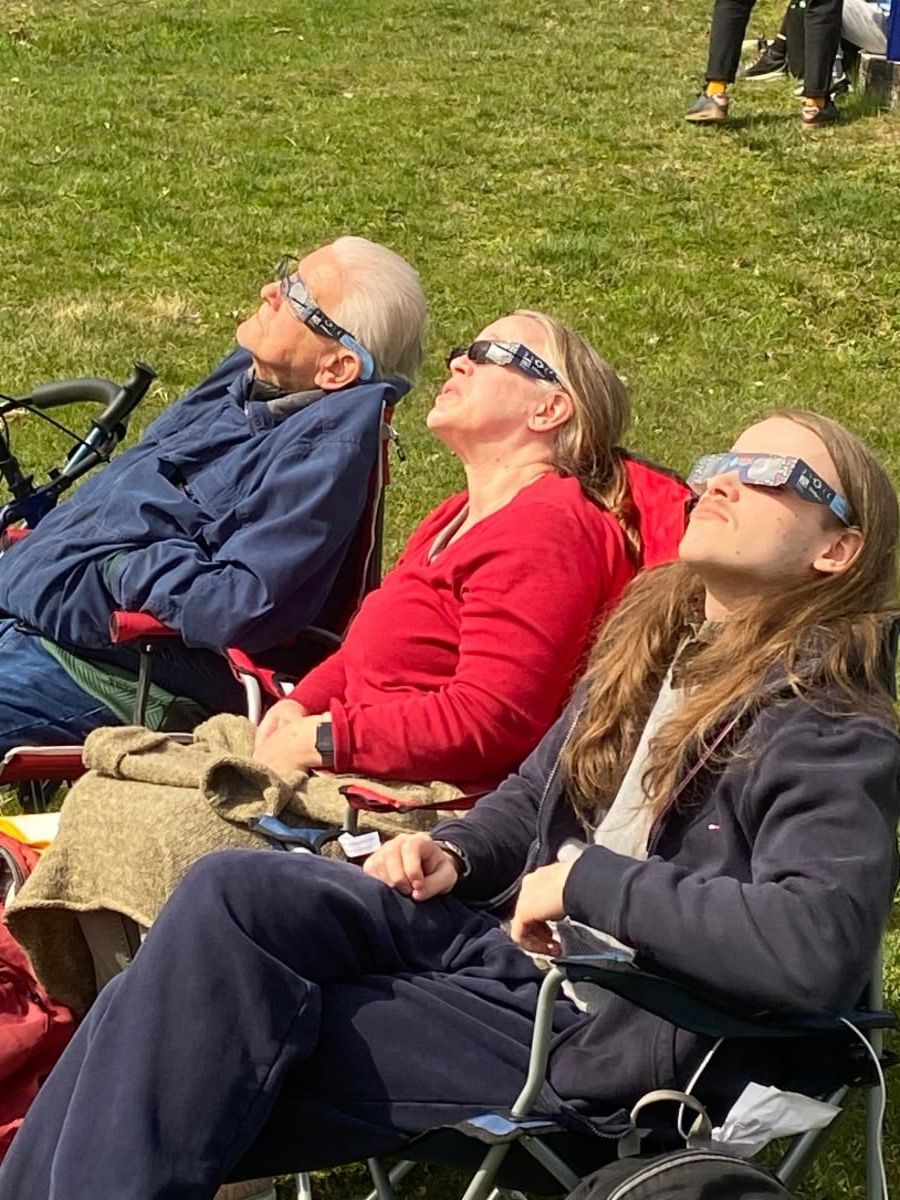 It was almost impossible to find the proper dark glasses on Long Island once I decided to go. But I eventually found 2 that came in a kit with a children’s book on the eclipse at the science museum in Port Washington. I brought the book with me and dozens of children and parents read the book on the train and passed it around.