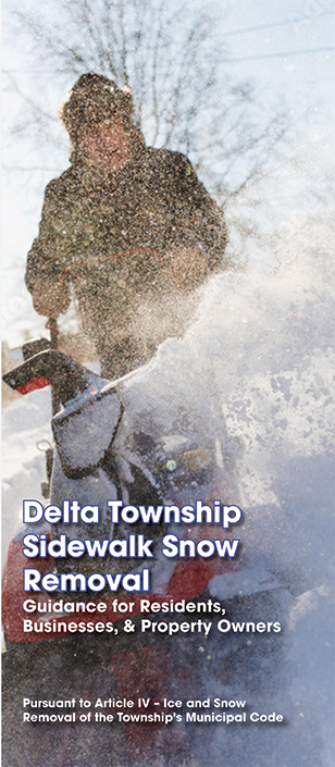 With Snow just around the corner, Delta Township property owners are reminded that they need to make arrangements to clear the snow and ice from sidewalks adjacent to their property. Section 34-92 of the Delta Township Code of Ordinances requires that snow and ice be removed from the sidewalk within 24 hours of a snowfall. The code applies even if the property is vacant or the building on the premises is unoccupied.
