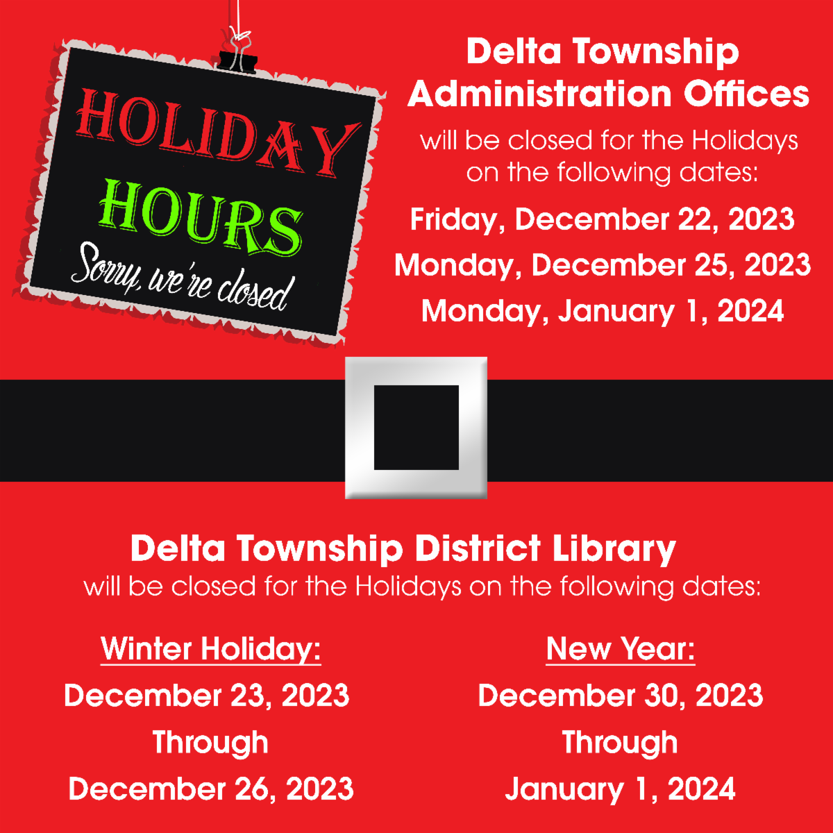 The Delta Township Administration Offices will be closed for the Holidays on the following Dates: