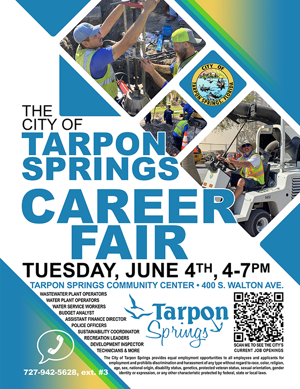 Great career opportunities are available in the City of Tarpon Springs, and those opportunities will be presented at a Career Fair Tuesday, June 4 at the Community Center, 400 S. Walton Ave. Openings are available in various departments including wastewater, water, finance, public safety, recreation, building development, and more. For more information on open positions and benefits, go to the city website.