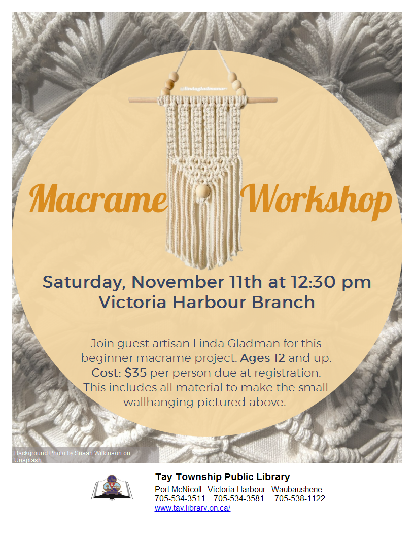 Join us Sunday, November 26th from 10 AM - 3 PM, at Oakwood Community Centre in Victora Harbour for our Festive Fundraiser. It is our seasonal craft show planned and hosted by the Marjorie Young Volunteer Association (MYVA) and Library staff in support of Tay Township Public Library. Join us for a warm drink, kids activity, check some names off your shopping list, or treat yourself! We do a have a few vendor spots left! If you are interested in becoming a vendor, the registration fee is $30 plus a donation to the prize table, all proceeds go to the MYVA group to support Library programs and special collections. For more information on becoming a vendor and to register please pop into a branch to pick up a copy of the registration form or send us an email!