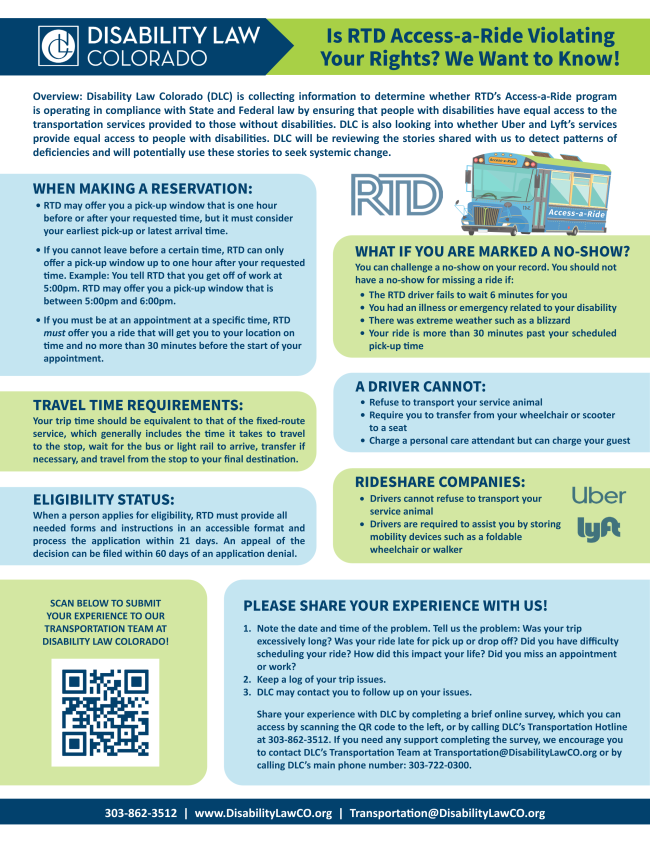If you have had any issues riding public transportation, including Uber or Lyft, Disability Law Colorado would like to hear about it. You can share your experience with them by completing a brief online survey - click here or call 303-862-3512. You will need the date and time of the problem, an explanation of the issue, and how it impacted your life, such as missing work or an appointment.