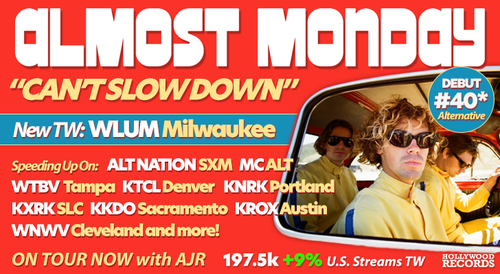 TOP SPINNERS: MUSIC CHOICE ALT, S/XM ALT NATION, KPNT, KITS, KXRK, WZNE, KNRK, WTBV, WJMZ-F2, KNRK, WFZZ, WBTZ, KYRK, WAQX, WRMR, WGHL & MORE...