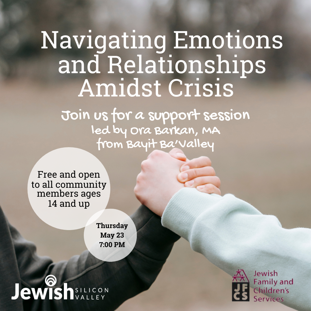 Join us for a meaningful support session. Since October 7th , many of us have felt a blend of emotions. Sorrow, grief, anxiety, concerns about the rising of antisemitism, and guilt affect our sense of safety, identity, and belongingness. Strong yet sometimes contrasting perspectives about the current war are projected on our close relationships, creating painful ruptures. We’ll offer a safe space to share your experiences, connect with others facing similar challenges.