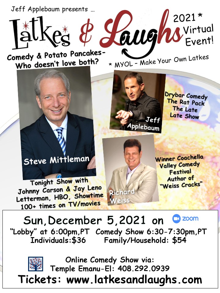 Temple Emanu-El in San Jose is excited to present it's Annual Latkes & Laughs show, available to everyone around the world via Zoom this year with some amazing talent! This is both a "FUNdraiser" and unique, virtual get together for the Jewish Community, on Sunday, December 5th, from 6:30 - 7:30pm, the final night of Chanukah.
