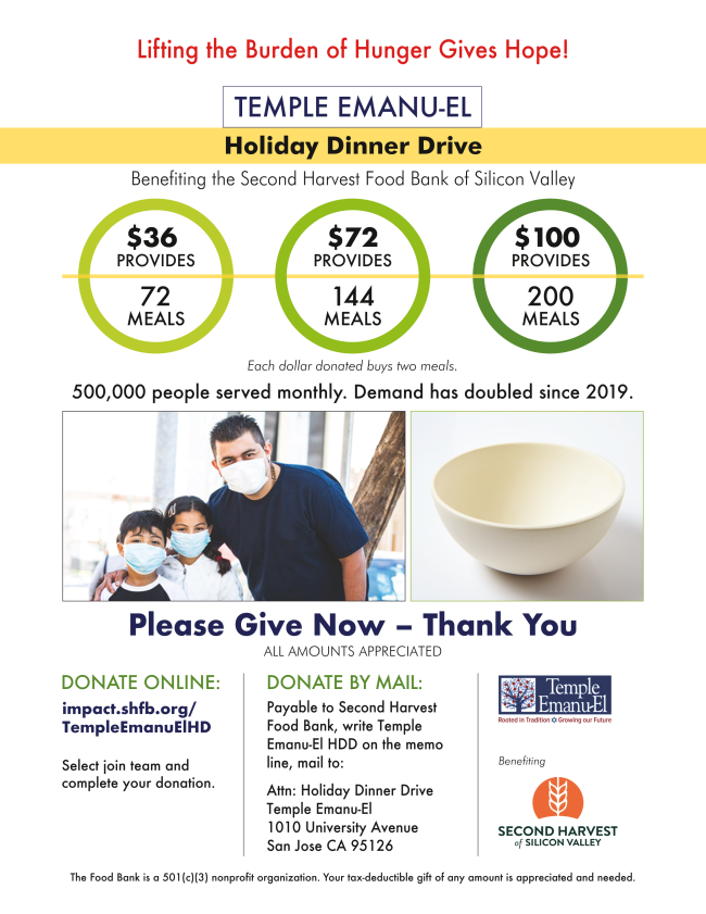 Join Temple Emanu-El as we support Second Harvest of Silicon Valley in their annual Dinner Drive. Every donation helps to provide meals for families in need. Any amount goes a long way to feeding those in our community.