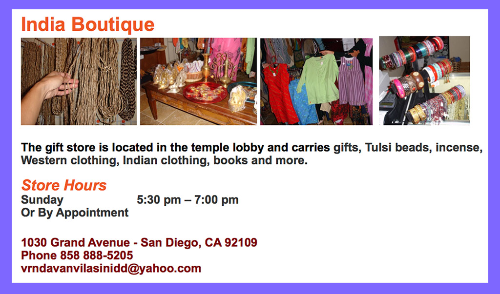 NOTE: The San Diego Hare Krishna Temple provides this classifieds section as a service to our community, but we have no way of analyzing every item, opportunity or service listed; therefore, we cannot guarantee or endorse any claims, products or services showcased in these listings.