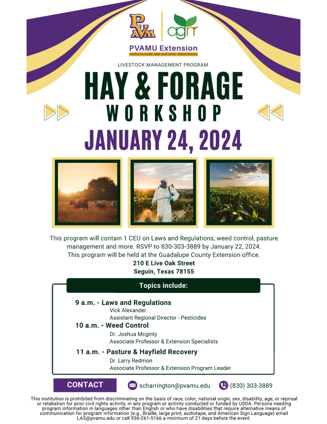 Texas A&M AgriLife Extension provides equal opportunities in its programs and employment to all persons, regardless of race, color, sex, religion, national origin, disability, age, genetic information, veteran status, sexual orientation, or gender identity. Individuals with disabilities who require an auxiliary aid, service, or accommodation in order to participate in meetings are encouraged to contact the Texas A&M AgriLife Extension Service office at 830-620-3440 five days prior to the event so that appropriate arrangements can be made. The Texas A&M University System, U.S. Department of Agriculture, and the County Commissioners Courts of Texas Cooperating | |