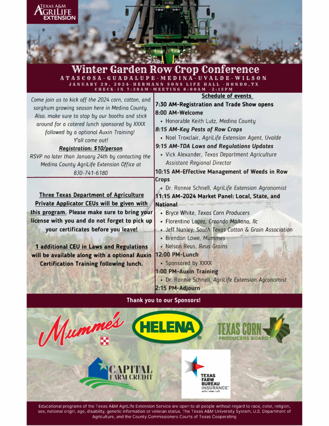 The Winter Garden Row Crop Conference will be held January 29, 2024 at the Hermann Sons Life Hall in Hondo, Tx.
