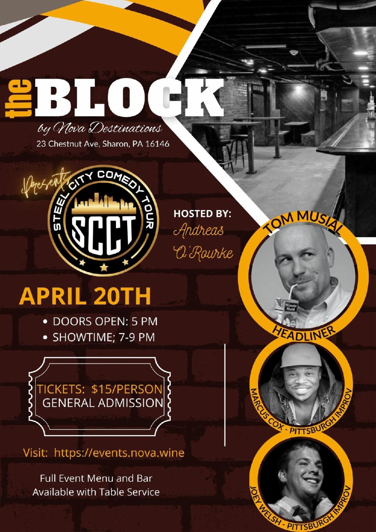 Join the BLOCK in Sharon for a Comedy Night presented by Nova Destinations - part of the Steel City Comedy Tour. The show takes place in the second floor event space with food and drinks available to purchase. Doors open at 5 and the show will start at 7 and will feature 4 different comedians! Tickets are $15.