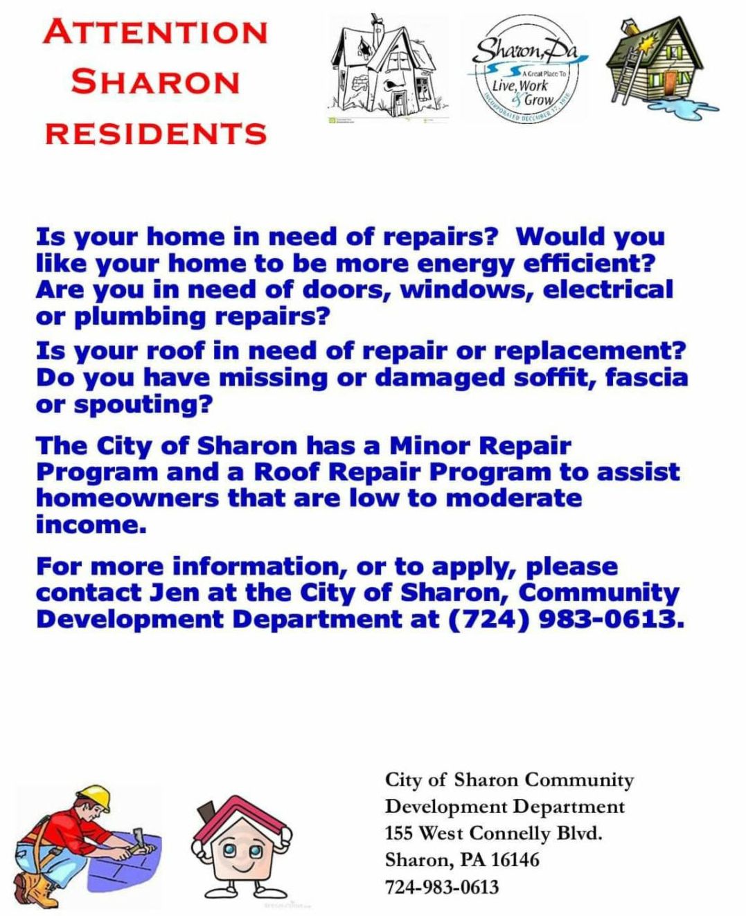 The City of Sharon is taking applications for its homeowner assistance programs for minor repairs and roof repairs. These programs are for Sharon homeowners with low to moderate income.