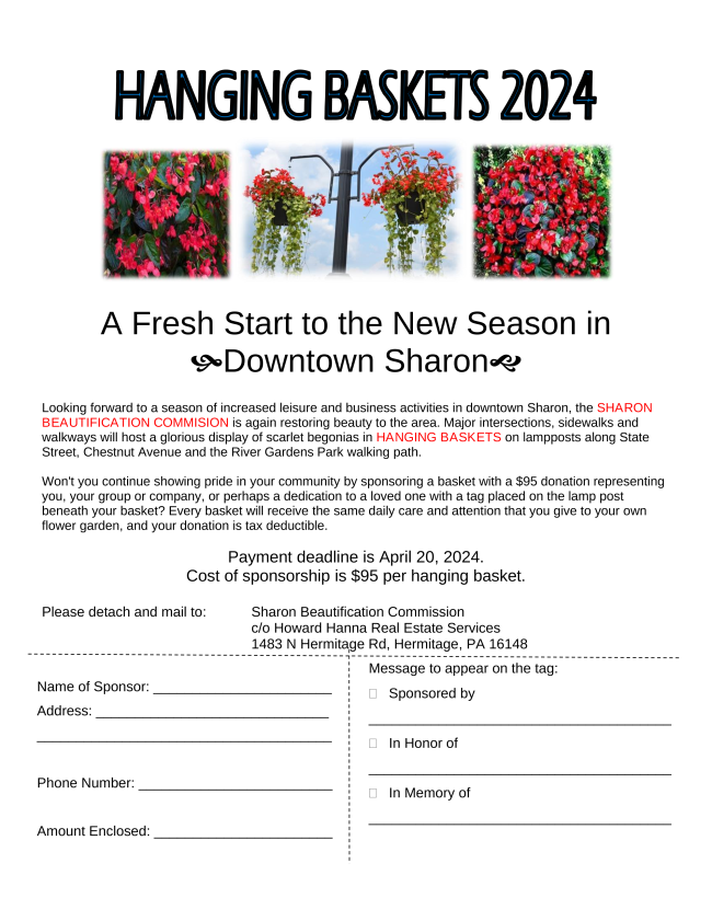 Sharon Beautification Commission has 22 bare root trees to plant at various sites throughout the city - Volunteers can meet 9 AM - Noon, Saturday, April 13 at the corner of Memorial Blvd. and Leslie St. (open field) near the Shenango Valley freeway and caravan to the other locations from there. Work includes digging holes, placing trees, planting trees, mulching and watering. Gloves and tools will be provided.