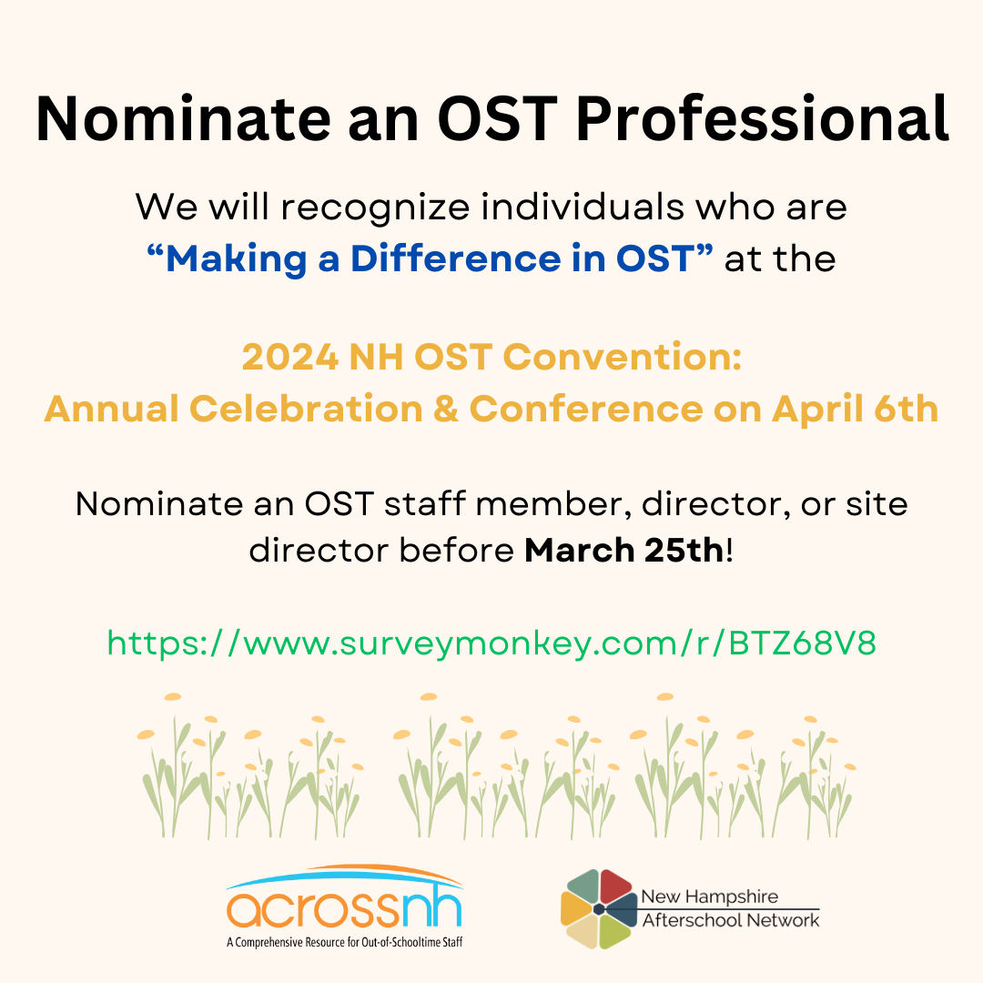 Once again, ACROSS NH is celebrating the difference made by the work of out of school time (OST) professionals in New Hampshire! If you know someone who is making a difference in the lives of children and families, go to https://www.surveymonkey.com/r/BTZ68V8 and make a nomination by March 25th. | |