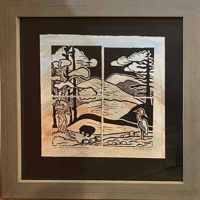 Gayle is inspired by the beauty of God’s creation and enjoys taking a natural form, such as a salamander, box turtle, bear, or blue heron and creating artwork exploring that form by printing with linoleum blocks on various types of paper. She experiments with the process of paper making by using natural fibers and parts of plants to color and strengthen the paper. She especially enjoys using paper made from grinding up paper wasp nests. This is “nature’s paper” and printing on this beautifully organic surface creates a unique and lovely result.