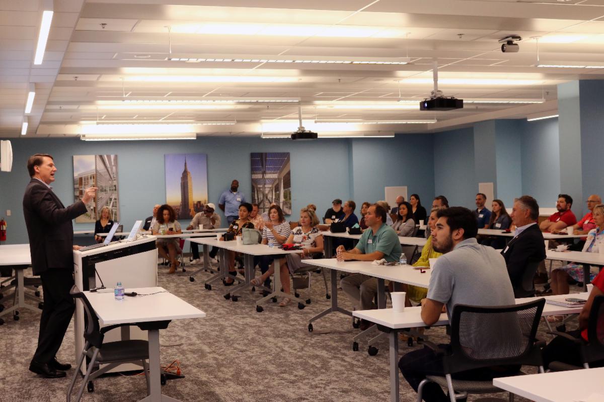 Jeff Littleton, executive vice president of ASHRAE, speaks to the Southwest Gwinnett Chamber about the energy-saving solutions built into the facility at 180 Technology Parkway. The building has solar wrap on windows and a small field of solar panels powering the building, among many other technologies. | |