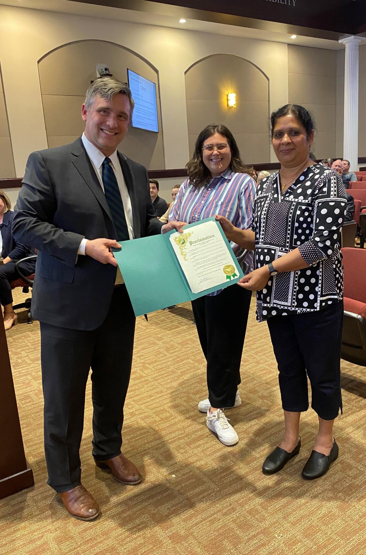 At the September 22, 2022 City Council Meeting, Mayor Jim Penniman-Morin issued a Proclmation Recognizing October 5, 2022 as World Teachers' Day. Westwood Elementary School teacher Padmini Bhat (right) was joined by former history teacher and current City of Cedar Park Parks intern Ari Azimi (center) to accept the Proclamation on behalf of all teachers! | |