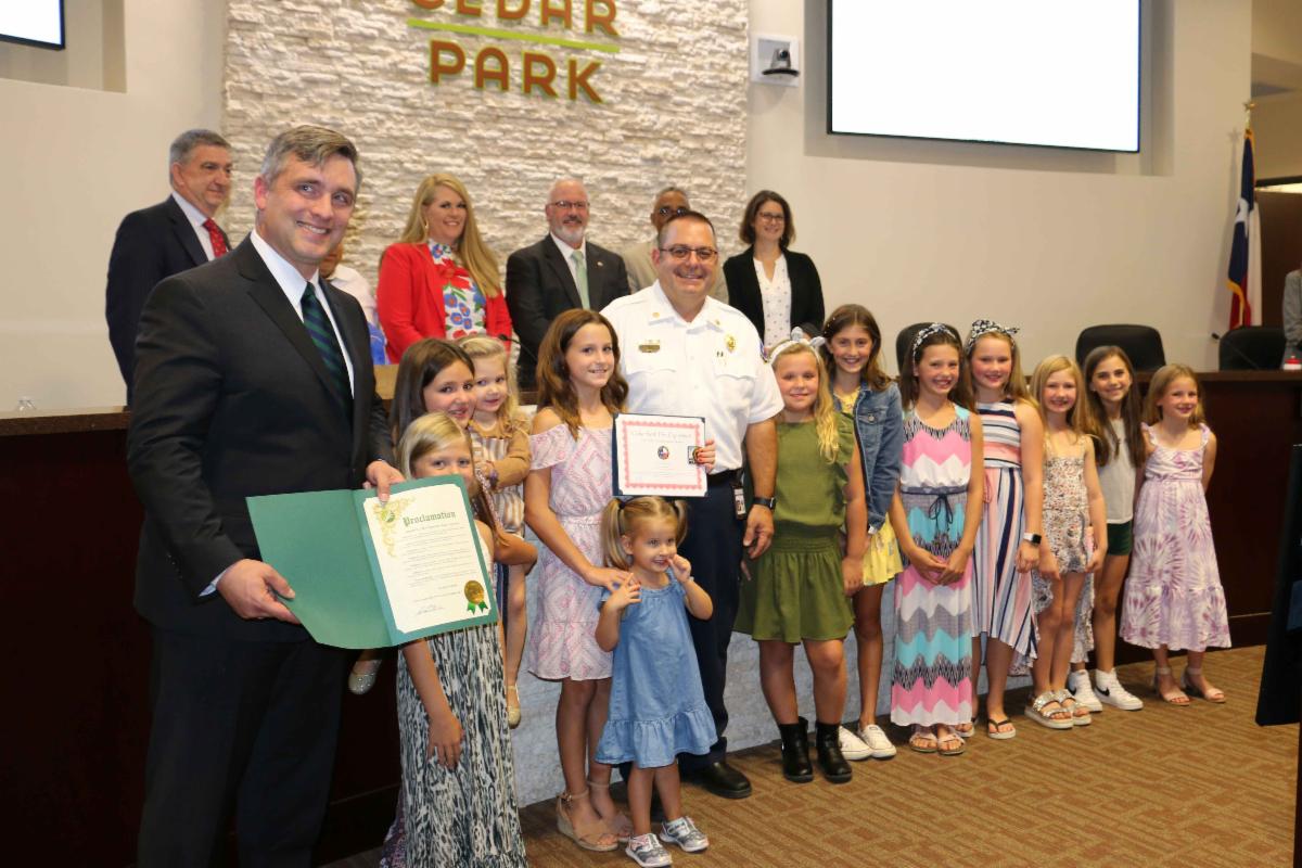 Cedar Park Fire Chief James Mallinger issued a Chief's Commendation and Challenge Coin and Mayor Jim Penniman-Morin made a Proclmation recognizing 10 year-old Charley Burton for saving the lives of her parents and 3 year-old sister during a recent early morning house fire.