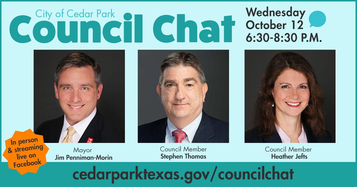 Make plans to attend the next City of Cedar Park Council Chat on Wednesday, October 12, from 6:30 to 8:30 p.m. You may attend in-person or on Facebook Live. This next Council Chat features Mayor Jim Penniman-Morin, Council Member Stephen Thomas and Council Member Heather Jefts, who will engage with you in an informal, lively discussion in which they'll take your questions and answer them. You may ask your questions live, during Council Chat or submit them in advance. | | |