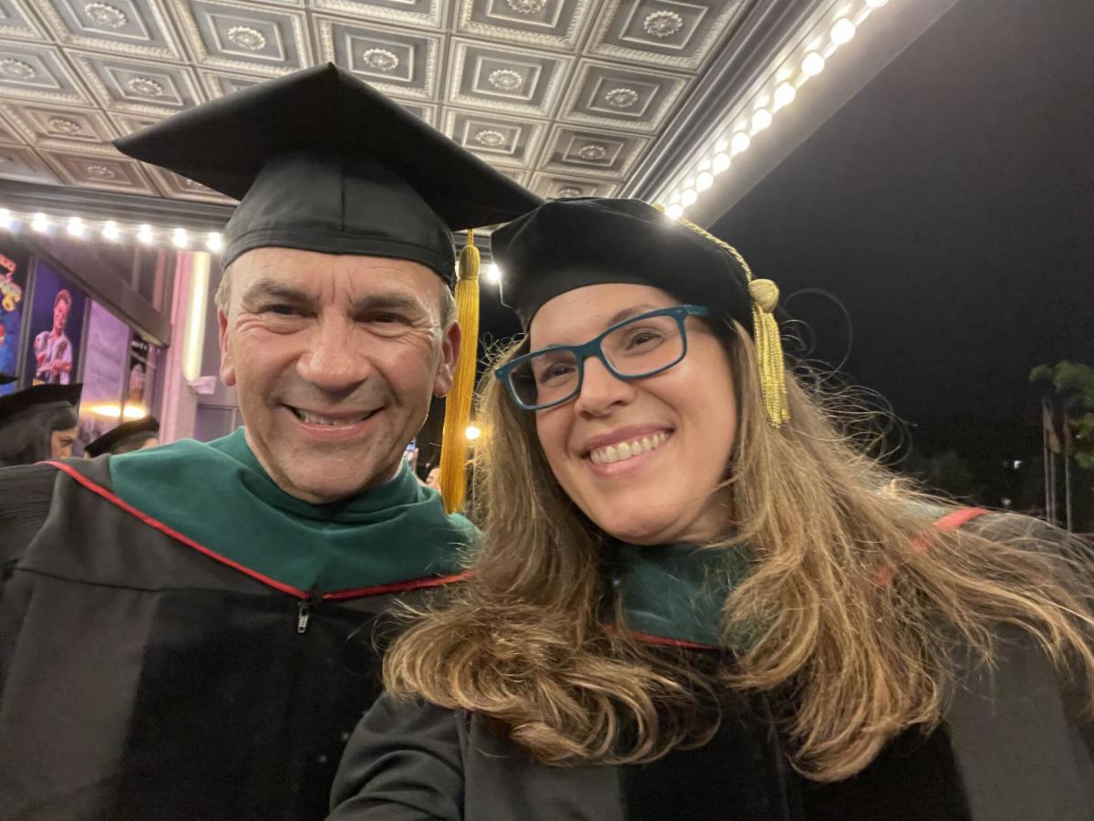 Convocation speaker Roberto Muñiz, president and CEO of Parker Health Group (pictured with Sonia Garcia Laumbach, MD, assistant dean for student affairs), shared his inspiring journey and how three caring healthcare professionals changed his life, urging the graduating class to take action when they are in a position to help others.