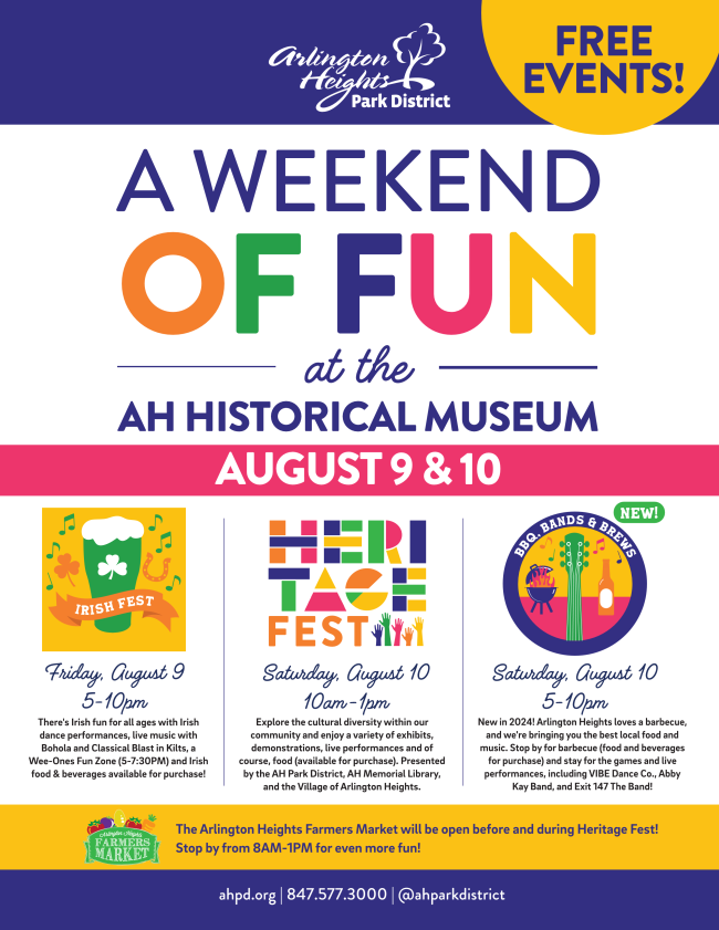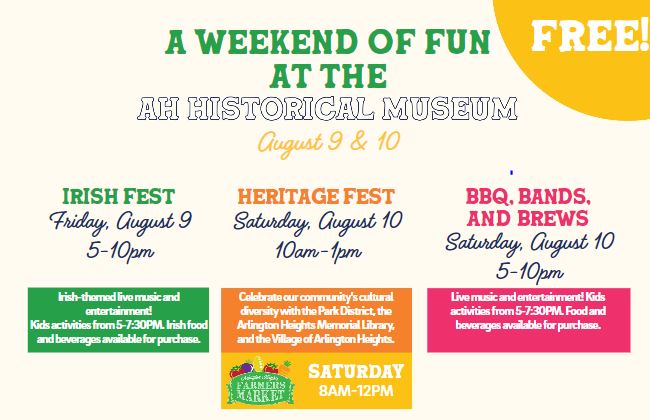 Be sure to come on out to the Museum August 9 and 10th when the Arlington Heights Park District hosts not one, but three events in one weekend! In two days Irish Fest, Heritage Fest, and BBQ, Bands and Brews! Bring family and friends for food, fun, music, culture, art, and BBQ!