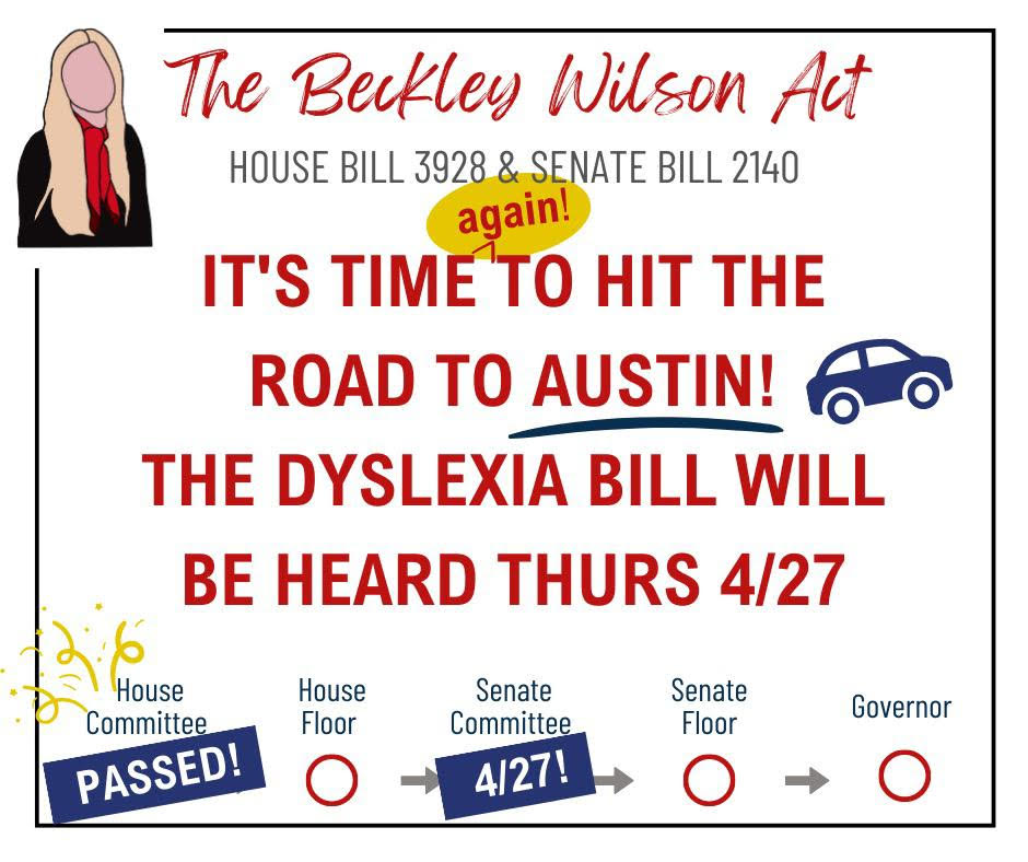 TODAY - the Senate Education Committee will hear the Beckley Wilson Act's Senate Bill, 2140. We are hopeful the committee will support it, but WE NEED YOUR HELP AGAIN! It's easy, just copy and paste the addresses below into an email to share your support of Senate Bill 2140, the Beckley Wilson Act. A sentence including the statement "I am for SB 2140" will work, but it would be even more impactful if you share why you care about dyslexia education in Texas. If you're a parent of a dyslexic student or dyslexic yourself, please mention it in your email.