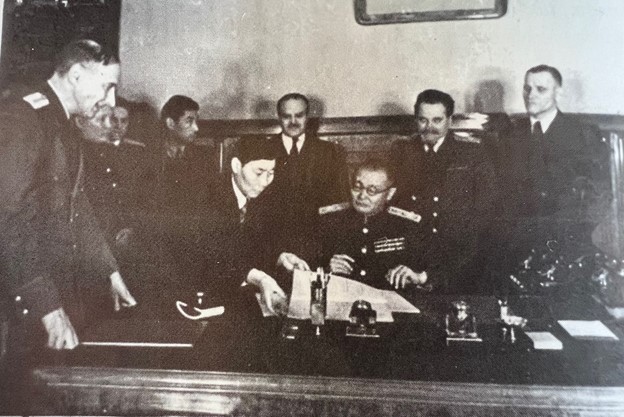 Stalin did buy an insurance policy in 1946 when he chose to recognize Mongolia as an independent state. The infamous Choybalsan is seated at the table while Molotov is standing behind him. You can only suspect that Molotov promised Choybalsan a special cocktail if he did not do as he was told. Mongolia remained under the control of Russia but enabled the rest of the uncaring world to believe it was not a part of China which was Stalin’s objective.