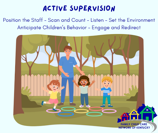 Whether you are inside the classroom or outside on the playground, we need to ensure we are maintaining proper active supervision. Some great strategies for maintaining active supervision include: Position the Staff, Scan and Count, Listen, Set the Environment, Anticipate Children’s Behaviors, and Engage and Redirect.