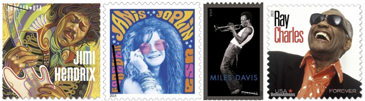 Remember when U.S. stamps honored great American role models like Lincoln, Franklin, and Washington? Here are some recent stamps, and here’s the question: What do these four have in common? Answer: Jimi Hendrix, Janis Joplin, Miles Davis, and Ray Charles were all heroin addicts. Nice role models, right?