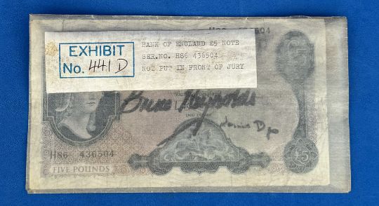 Prepare to own a remarkable piece of British history with this collectible item: a £5.00 note signed by notorious figures Ronnie Biggs and Bruce Reynolds, connected to the infamous Great Train Robbery of 1963. Recovered from Leatherside Farm, this note comes in its original evidence pouch, showcasing its authenticity and significance. In good condition, this rare memorabilia piece not only serves as a testament to a pivotal moment in British criminal history but also stands as a unique investment opportunity for serious collectors and enthusiasts alike. With an estimated value of £300-400, this item is sure to attract attention at our upcoming auction, held by Chaucer Auctions, a trusted name in the collectibles market. |