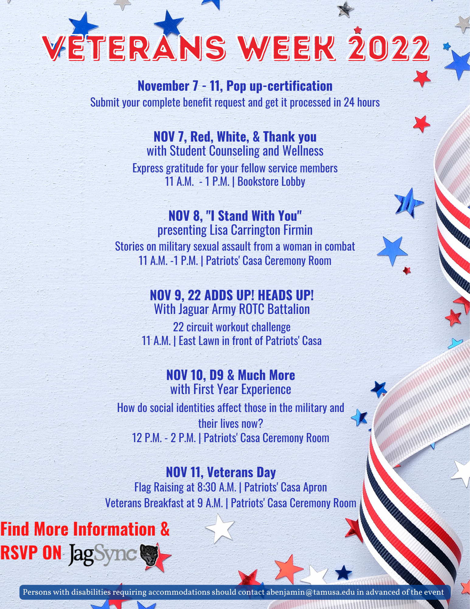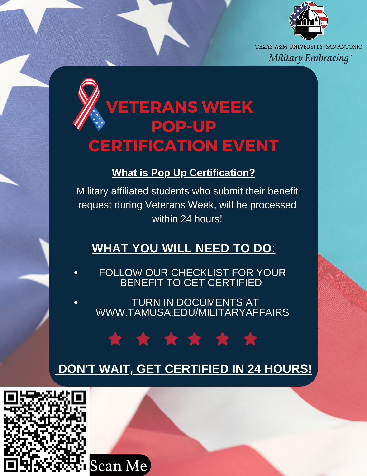 The Office of Military Affairs will also be offering 24-hour VA Processing (Pop-up Certification Event) to students using VA Education Benefits. Students must register and submit a benefit request during Veterans Week. Click flyers above to expand. | |