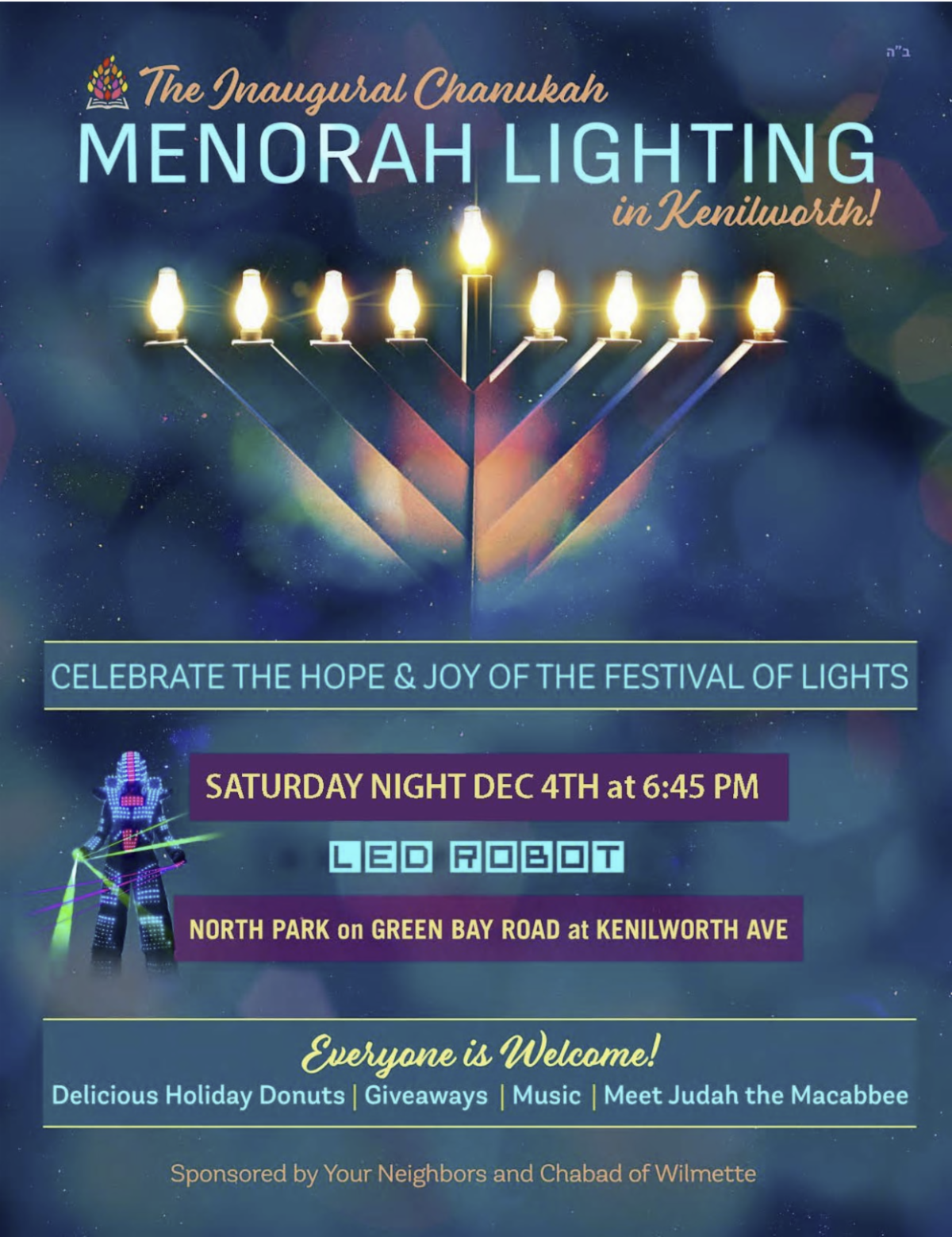 We are excited to announce the momentous, inaugural Hanukkah menorah lighting in Kenilworth! A public menorah will proudly stand in North Park on Green Bay Road at Kenilworth Ave throughout the holiday. Everyone is invited to celebrate the festival of lights with music, sweet Hanukkah treats, and entertainment for the kids on Saturday, December 4th at 6:45pm.