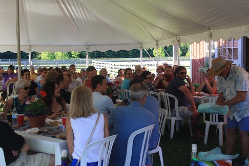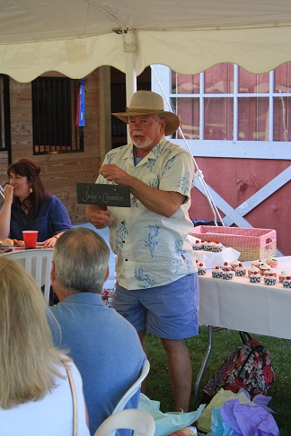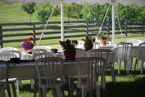 According to Amelia Ambrose, our Executive Director, there were 100 people planning to attend. This year the tent was enlarged as the barn was for dancing and blue grass music. Guests began arriving at 4:00 p.m., to the hunger inducing smell of chicken being grilled. In addition to the chicken, there were pulled pork, macaroni and cheese, scalloped potatoes, and coleslaw for the main meal.