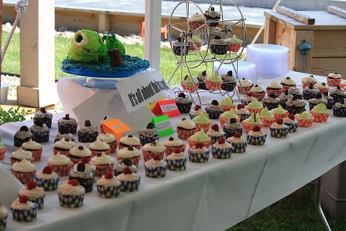 Excess dinners were packaged as takeouts. I did not hear about left over cupcakes, though. Abby Salawage, Esq., proved again that she has a skill other than attorney. Abby provided four different varieties of cupcakes: Oreo cupcakes, lemon raspberry cupcakes, and the highly praised lime margarita cupcakes with tequila and chocolate stout cupcakes with Guinness. She finished her dessert display with a topper of a bass coming out of a pond. Everyone commented both on her cupcakes and the blue grass band.