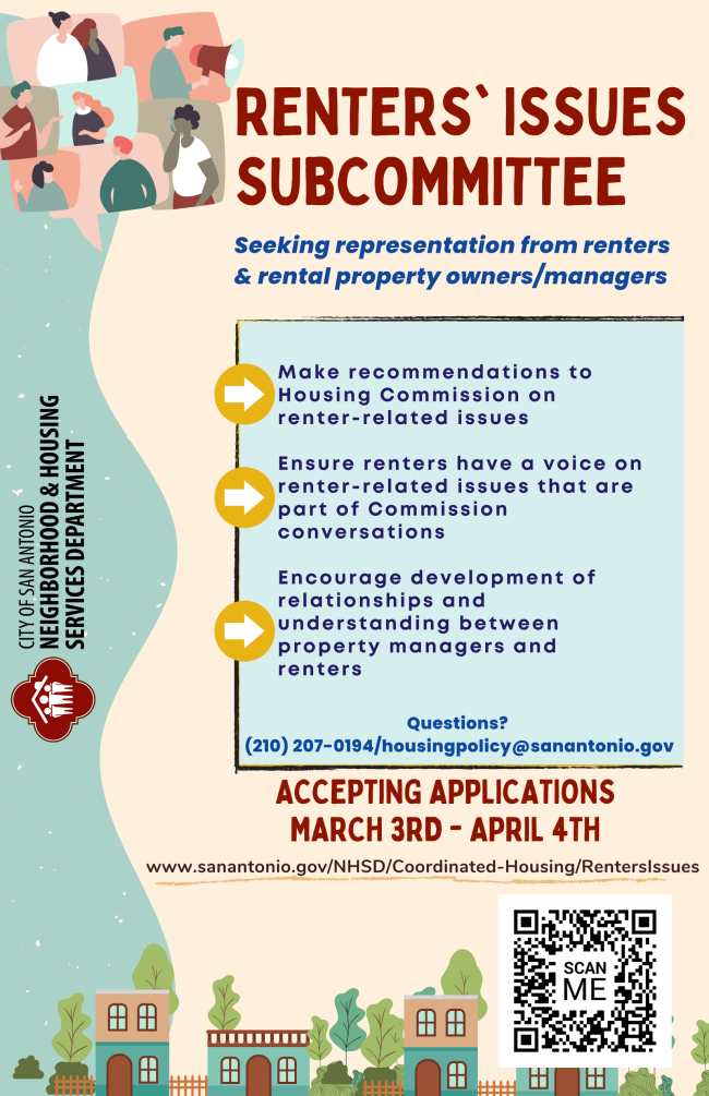 Renters’ Issues Subcommittee (RIS): The RIS will advise the Housing Commission on renter-related issues including, but not limited to: rental assistance; tenants’ rights & legal aid; education, outreach, and legislative items. We invite renters, rental property managers, and rental property owners to apply to serve on the subcommittee. Four renters and three rental property managers/owners will be selected for the subcommittee.