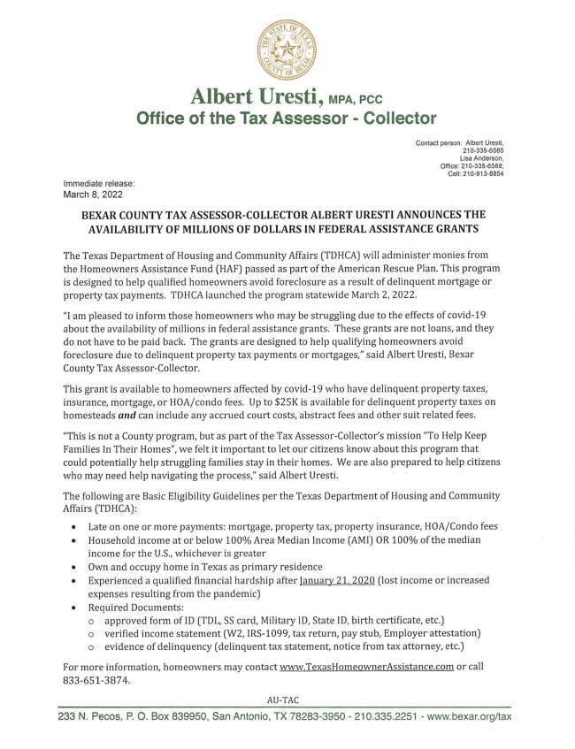 There are a few elections coming up that we should all have on our radar. The next step for the 2022 bond is an election on May 7th, you can find more information on the bond at www.sanantonio.gov/2022bond. Did you also know that the State is holding an election on two proposed amendments to the Texas Constitution on May 7, 2022? Go to Votetexas.gov for more information on those proposed Constitutional Amendments.