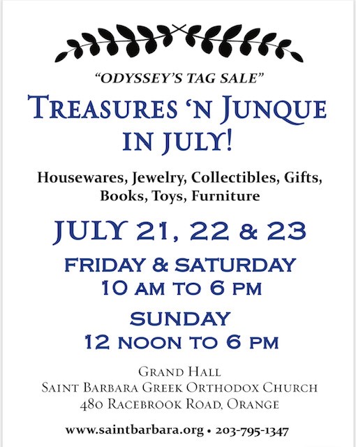 ORANGE, CT -- Saint Barbara Greek Orthodox Church announced details today regarding "TREASURES 'N JUNQUE IN JULY," a 3-day giant indoor tag sale, to be held July 21, 22 and 23, in the Church’s Grand Hall, 480 Racebrook Road in Orange, CT. Treasures ‘n Junque in July (formerly held during OUR ODYSSEY Greek Festival), is busy transforming our Grand Hall into a spectacular, expansive bazaar. This huge event offers something for everyone. Find electronics, housewares, jewelry, collectibles, linens, framed art, books, DVDs, toys, seasonal treasures, furniture, and more.