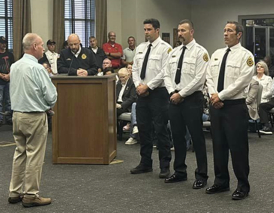 Congratulations to Battalion Chief Marc London, Captain Curtis Sauers, and Lieutenant Zach Lundberg on their recent promotions and swearing in! | |