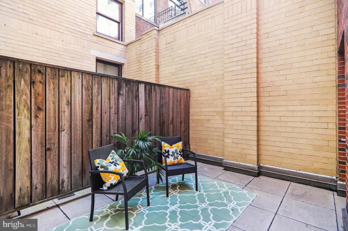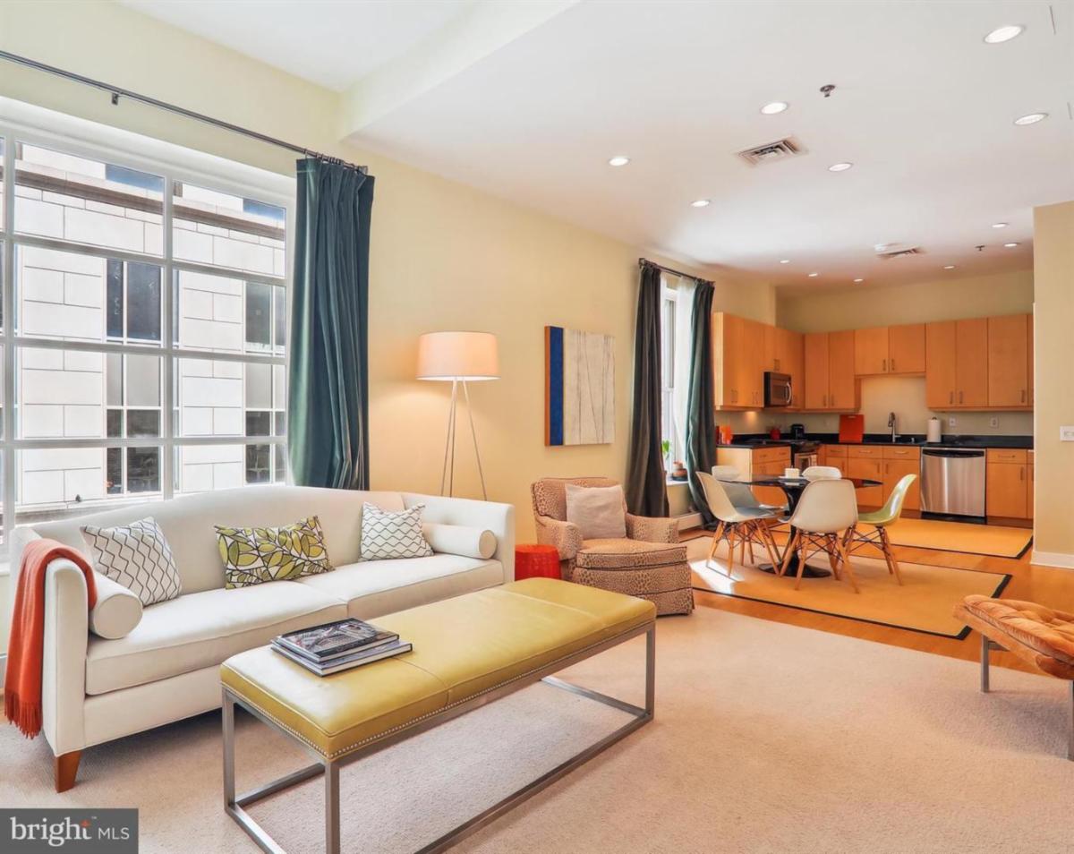 This contemporary one-bedroom, one-bath home with private terrace in Penn Quarter features a generous open layout, over-nine-foot ceilings, hardwood flooring and oversized windows. A storage space conveys with the unit.