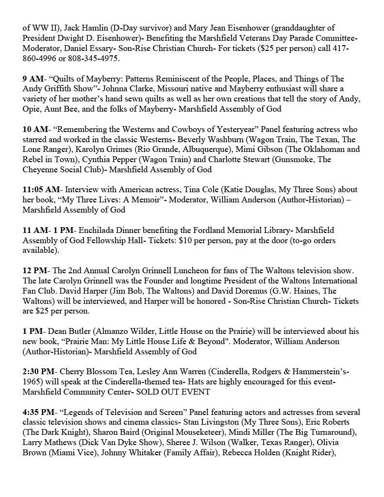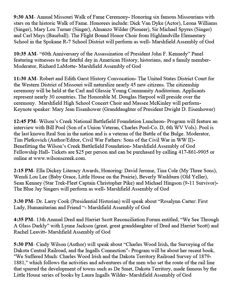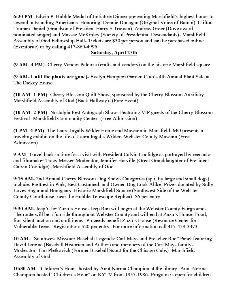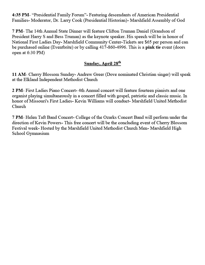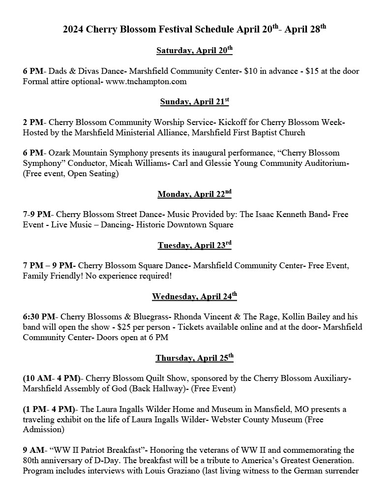 Later, Inman formed the first "cherry blossom festival committee" for the 2006 blooming season. A dedicated and faithful group of community members volunteered and helped plan, organize, and establish Missouri’s only Cherry Blossom Festival. The festival has been featured on CBS Sunday Morning and in 2014 Former First Lady Laura Bush gave the keynote address at the Cherry Blossom Festival Gala Dinner. Now, in its 18th year, the Missouri Cherry Blossom Festival has welcomed visitors to Marshfield from across the globe. The festival, which takes place the last full weekend in April has grown into a multi-day event, which focuses on the festival’s mission to preserve and promote American History, Missouri State History and Webster County History. The festival is a bi-partisan weekend that celebrates the history that unites us all as American citizens.