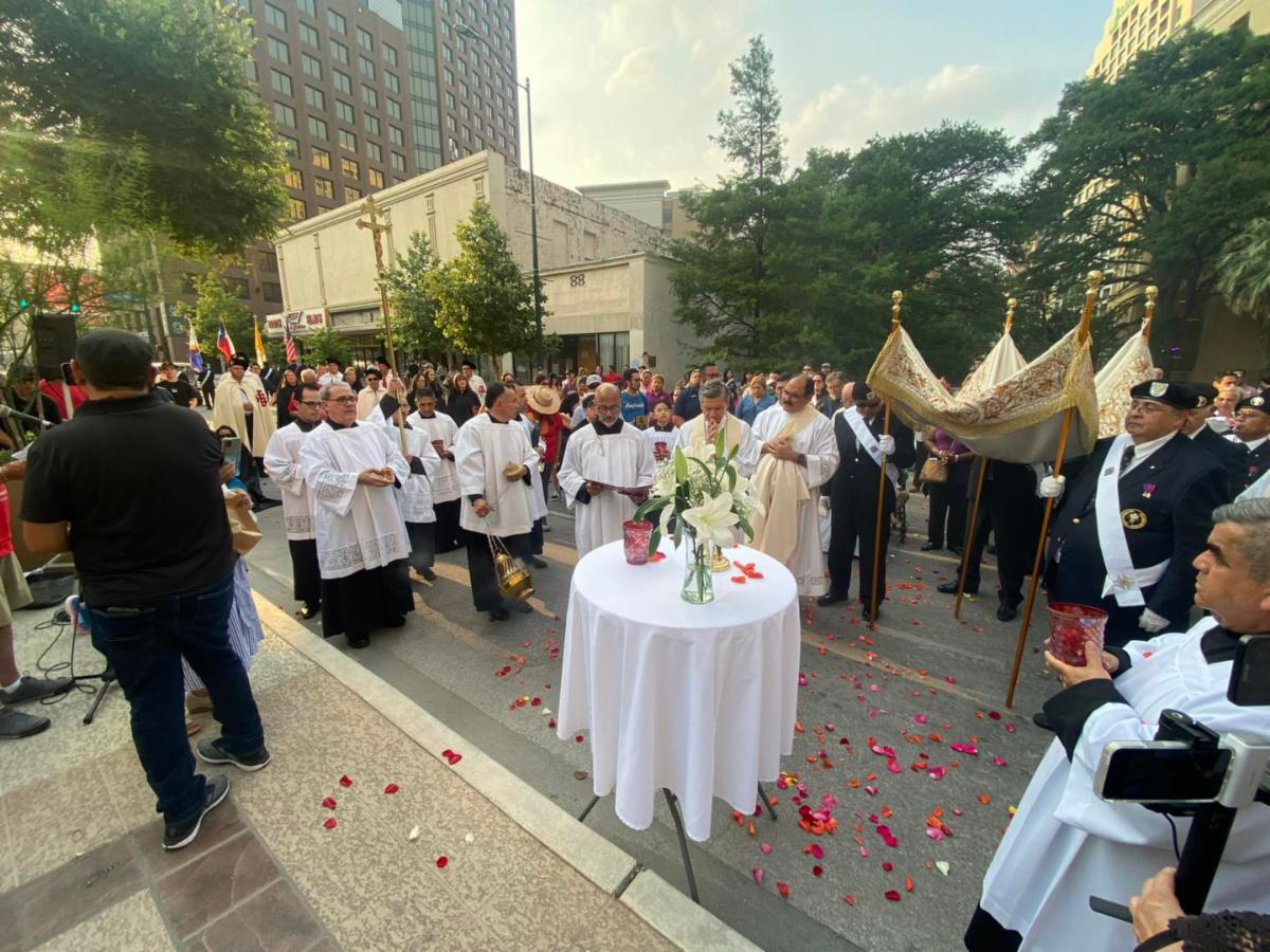 Veronica Markland | Today's Catholic Newspaper | The faithful of the archdiocese gave witness to the Real Presence of Jesus in the Holy Eucharist during a feast of Corpus Christi procession through downtown San Antonio on June 1 following the 5 p.m. Mass at San Fernando Cathedral. More than a quarter million flower petals were placed in the path of pilgrims in Adoration of the Lord through praying and singing. | |