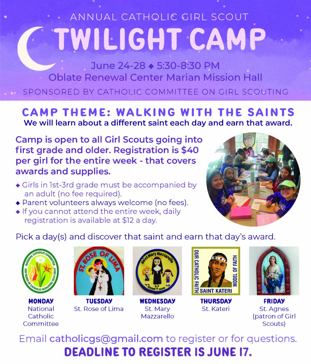 The Catholic Committee on Girl Scouting invites all Girl Scouts going into first grade or older to the Annual Catholic Girl Scout Twilight Camp June 24–28 from 5:30 p.m. to 8:30 p.m. at the Oblate Renewal Center Marian Mission Hall (directions). The theme is “Walking with the Saints” where girls will learn about a different saint each day. Registration per girl is $40 for the week or $12 for individual days. Girls in first through third grade must be accompanied by an adult. Parent volunteers are welcome. To register, email catholicgs@gmail.com. The registration deadline is June 17. | |
