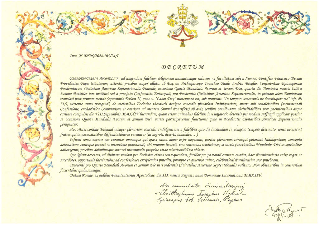 Pope Francis grants a plenary indulgence for Catholics across the United States who celebrate the fourth World Day for Grandparents and Elderly on September 8, 2024, under the usual conditions for such indulgences. See the apostolic decree here. | |