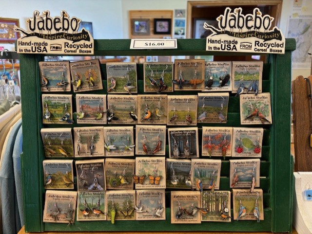 Jabebo's earrings are a fan favorite here in the Crane's Nest. Handmade from recycled cereal boxes they are light AND delightful! We have 32 species available through out online store so there's something for everyone. Click on More Images to see them all - Order online today!