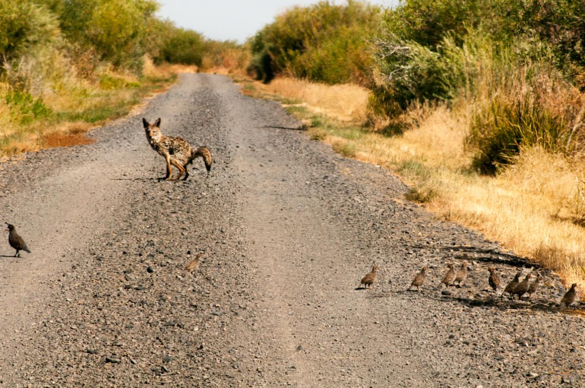 I was driving along the auto-tour road and stopped for a bunch of quail in the road. I watched them for a minute and this coyote came out from the bush on the right. He stopped up the road a bit and gave me a dirty look. He then dropped a turd just to tell me what he thought of me for interrupting his lunch. The quail seemed happy and moved off the road and I went on my way. ~ Gene Newell, Photographer (More HERE) | |