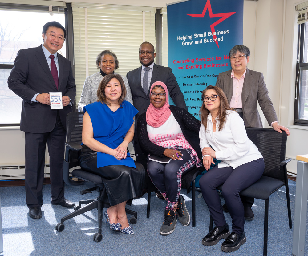 From left: Xiaoqi Ma; Rosa Figueroa, director of the Small Business Development Center (SBDC) at LaGuardia Community College; Congresswoman Grace Meng; Adrian Jones; Janeé Jones; Yvette Laboy; and Ying Zhou, interim associate director of the SBDC Queens College Outreach Center. | |