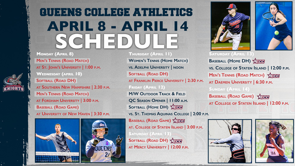 This week, men’s tennis travels to Fordham University on Wednesday at 3 pm and Daemen University on Saturday at 6:30 pm. Baseball will be on the road on Wednesday to take on the University of New Haven at 3:30 pm and then will play a four-game series vs. the College of Staten Island beginning on Friday. Softball has a busy week of action with four doubleheaders on the slate. They visit Southern New Hampshire University on Wednesday and Franklin Pierce on Thursday, both at 2:30 pm. They then host St. Thomas Aquinas on Friday at 2 pm and head to Mercy University on Saturday at 12 pm. Track and field will host the QC Season Opener on Friday at 11 am, and women’s tennis returns to action with home matches vs. Adelphi University on Thursday at 12 pm and Goldey Beacom College on Saturday at 7 pm.